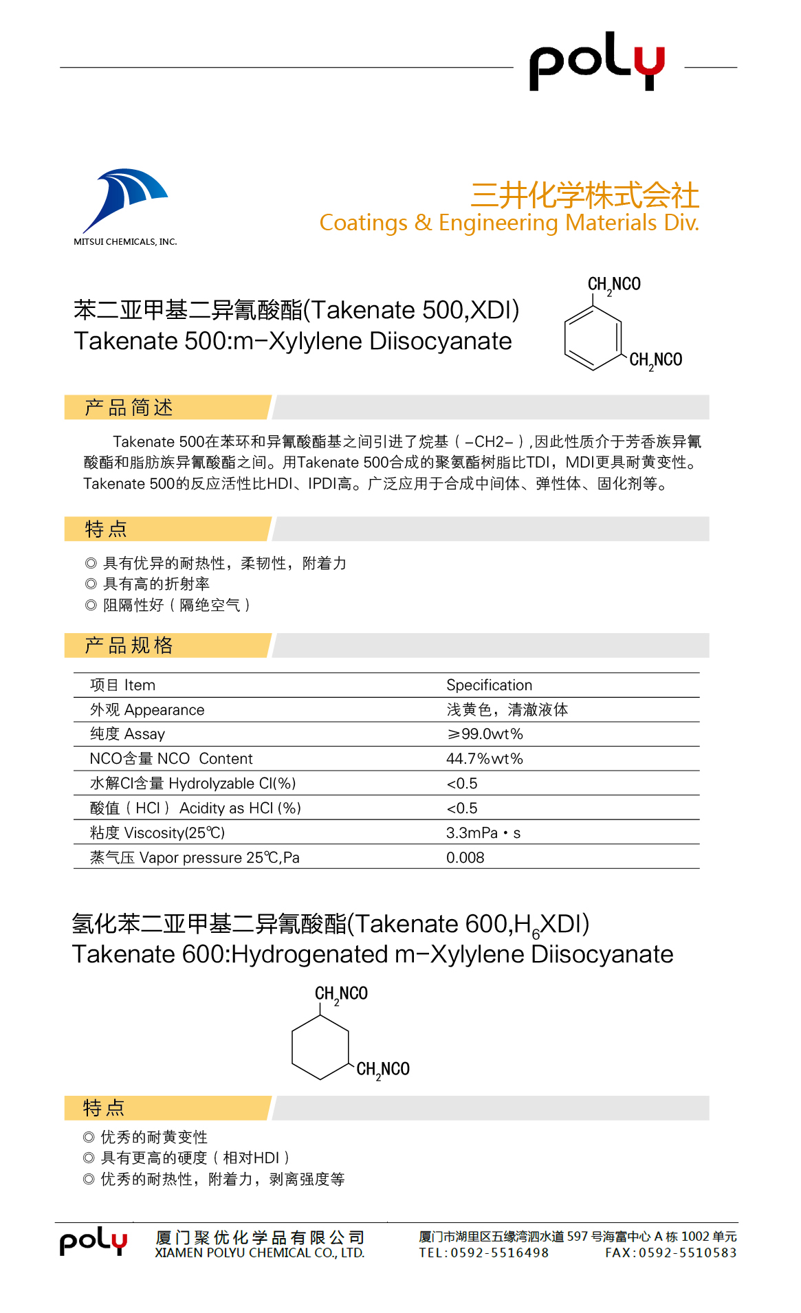 氯化苯二亚甲基二异氰酸酯 Takentate 600,H6XDI