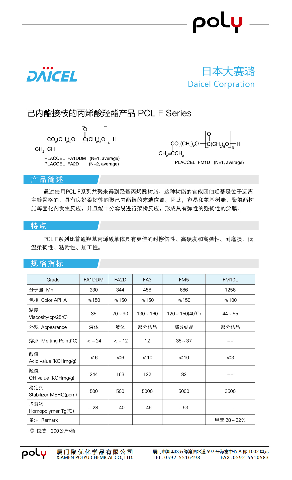 己内酯接枝的丙烯酸羟酯产品 PCLFSeries