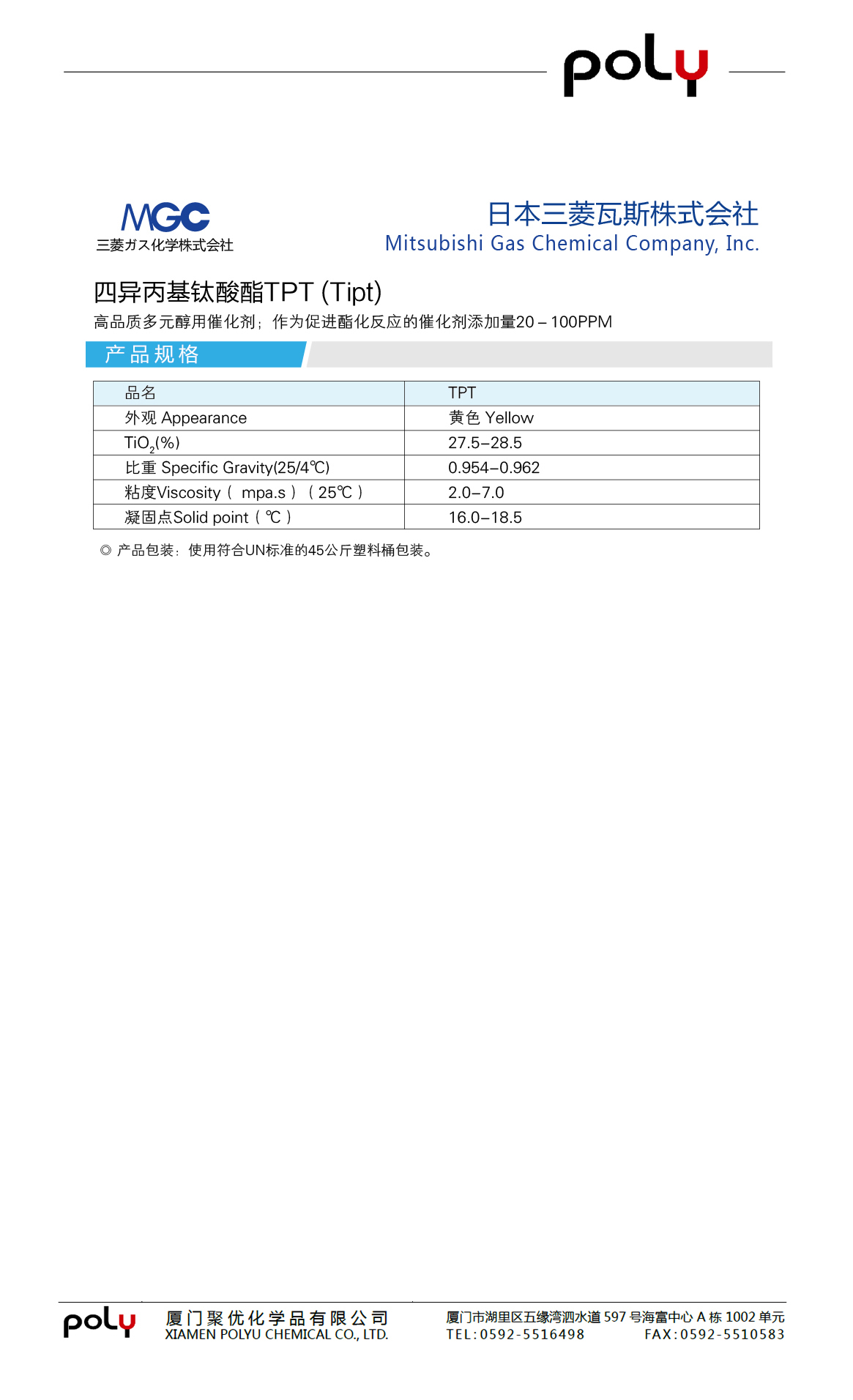 > > 多元醇用催化剂:四异丙基钛酸酯TPT